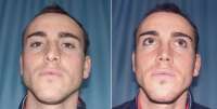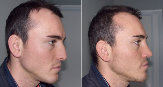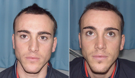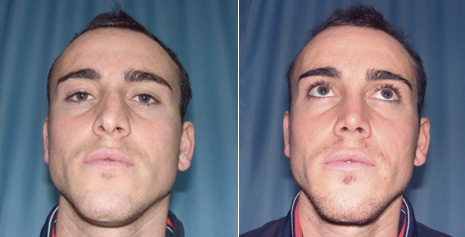The profile shows the clear difference between the nose before and after the rhinoplasty. The photo on the right shows the correction of the slight hump of the nose with a consequential aesthetic improvement of the profile besides the notable improvement in nasal functions. The patient, a professional soccer player, resumed his professional competitive activities and the nose recovered the normal robust features it had before the trauma.