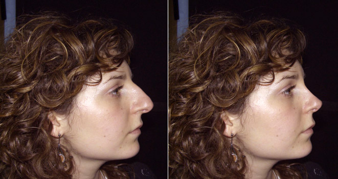 Le due fotografie affiancate, proposte qui in alto, mostrano dapprima un profilo curvo con naso in tensione a confronto con la simulazione del risultato in cui si propone un profilo lineare. In questo caso si è proceduto allo studio del profilo destro della paziente.
