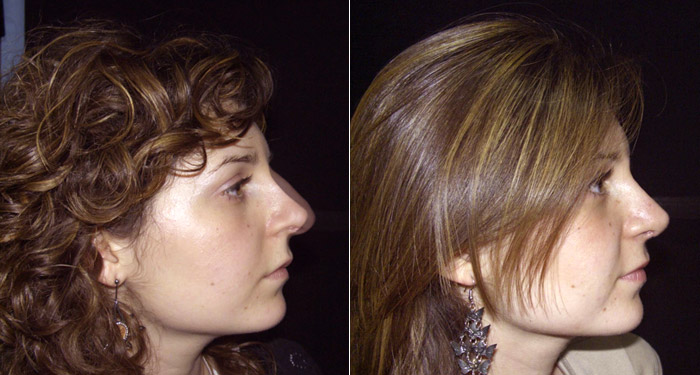 Nelle fotografie qui in basso si è proceduto invece allo studio del profilo di sinistra, proponendo sempre l'affiancamento della fotografia della paziente con la simulazione del risultato post chirurgico.