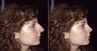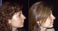 Le due immagini in basso mostrano due situazioni diverse: la prima fotografia mostra la sovrapposizione dell'immagine reale con quella della simulazione, che permette al paziente di valutare in modo tangibile l'entità del cambiamento. La fotografia successiva mostra la paziente dopo l'intervento di rinoplastica; il risultato post chirurgico dimostra quanto sia veritiero e attendibile lo studio dell'immagine eseguito e come la soluzione prospettata sia sostanzialmente coincidente con il risultato ottenuto.