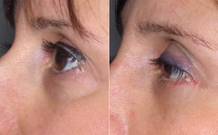 La paziente presentava delle borse palpebrali inferiori ed un abbassamento della regione zigomatica. E' stato eseguito un intervento di blefaroplastica per la rimozione di una piccola quantità di grasso dalle borse palpebrali.