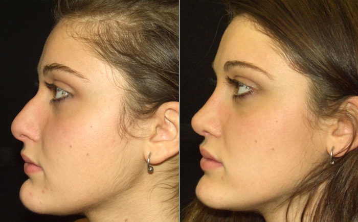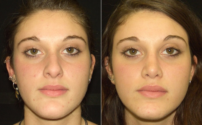 Il duplice intervento di rinoplastica e mentoplastica si è svolto nella medesima seduta operatoria, riducendo lo stress operatorio e i tempi di convalescenza post operatoria, sostanzialmente coincidenti per entrambi gli interventi. La paziente, nell'immagine a sinistra, mostra un mento pronunciato che è stato corretto semplicemente asportando del tessuto grasso che si frapponeva tra i muscoli e la porzione ossea del mento.