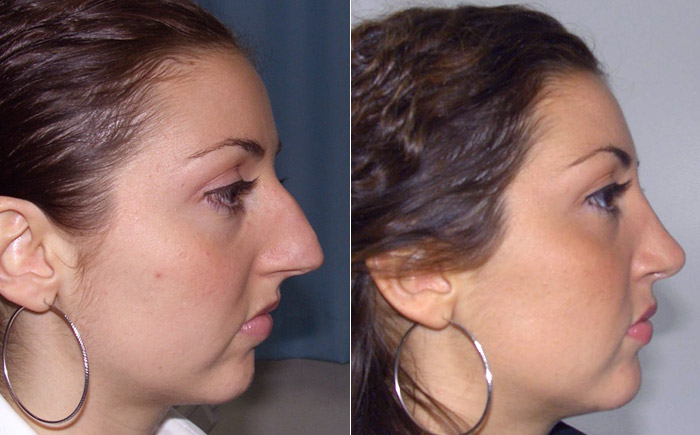 La paziente prima dell'intervento di rinoplastica mostrava un profilo curvo per un'eccessiva crescita del setto nasale, che ha portato in avanti tutta la piramide nasale e la punta. Questa forma del naso crea problemi funzionali oltre che estetici, derivanti da una scorretta circolazione dell'aria nel naso.