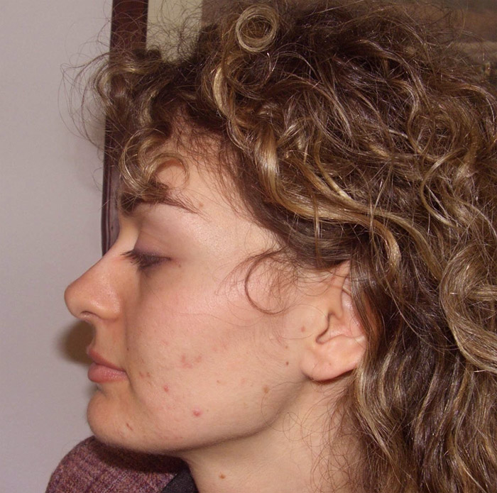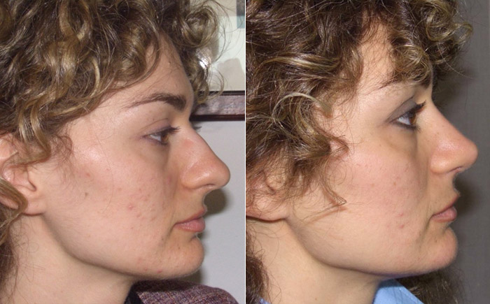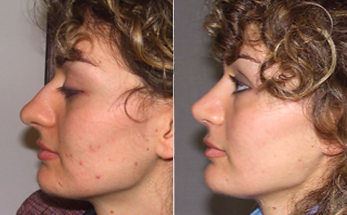 Sono stati messi a confronto il profilo del viso prima dell'intervento e dopo l'intervento per mostrare come il viso abbia assunto un profilo molto più dolce e lineare, rispettando le proporzioni fra naso, bocca e mento.