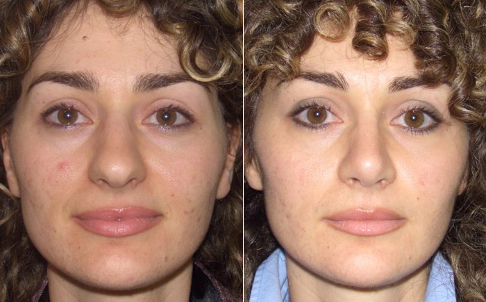 Visione frontale prima e dopo l'intervento. Il viso risulta molto più armonico e dolce nelle linee e nelle proporzioni, dopo un semplice e poco invasivo intervento di rinoplastica.