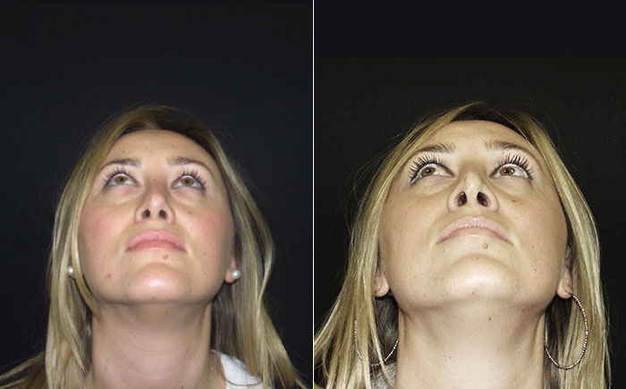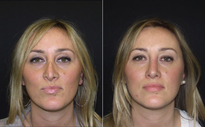Nella visione di fronte si nota una netta irregolarità del dorso del naso, della punta e delle narici. L’intervento ha previsto l’asportazione delle parti in eccesso e l’utilizzo di innesti cartilaginei prelevati dal setto della paziente che hanno permesso di ricostruire la struttura e la funzione nasale.