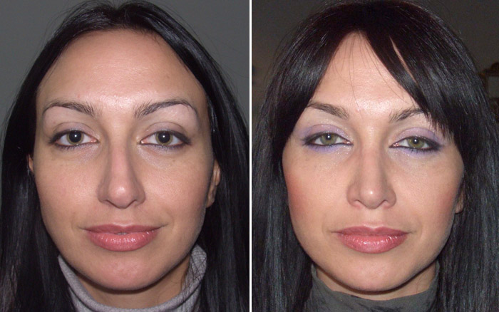 Anche il volto in posizione frontale ha acquistato un aspetto più armonioso con volumi più bilanciati e in armonia con tutti i tratti del viso. Si nota come la punta del naso, nell'immagine a destra, doni al viso un'eleganza e una proporzione naturale al naso stesso creando un concetto di bellezza naturale.
