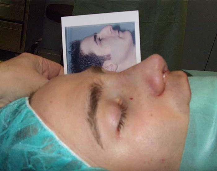 L'immagine qui sotto mostra il paziente immediatamente dopo l'intervento di rinoplastica. Dietro all'immagine del paziente, ancora sotto l'effetto dell'anestesia, è stata messa a confronto la foto dello stesso antecedente all'intervento di rinoplastica, per porre a confronto i due profili del naso.