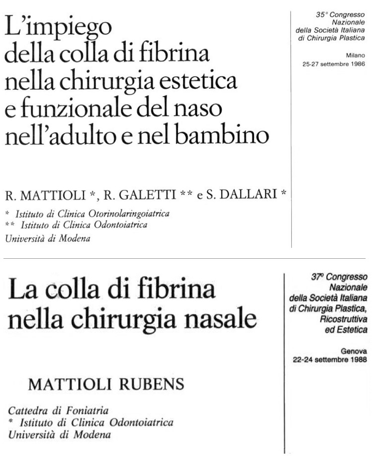 Nel primo congresso, il Prof. Mattioli, insieme al Prof. Galetti dell'Istituto di Clinica Odontoiatrica dell'Università di Modena ed al Prof. Dallari dell'Istituto di Clinica Otorinolaringoiatrica della stessa Università, ha relazionato sul tema: "L'impiego della colla di fibrina nella chirurgia estetica e funzionale del naso nell'adulto e nel bambino".
