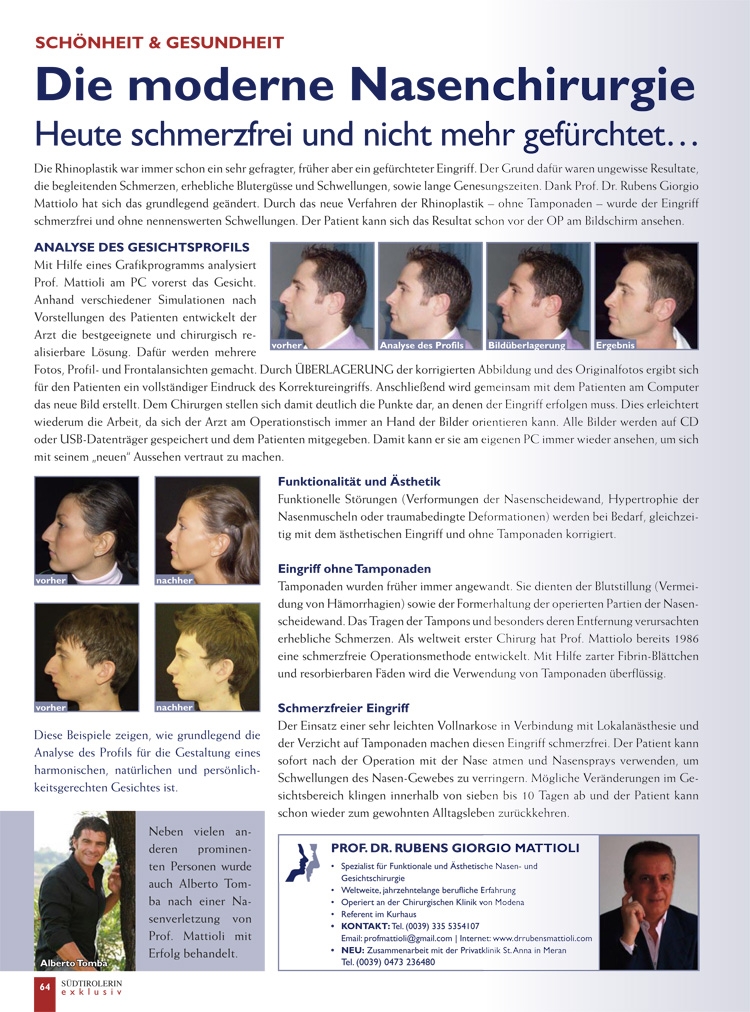 Die Rhinoplastik war immer schon ein sehr gefragter, früher aber ein gefürchteter Eingriff. Der Grund dafür waren ungewisse Resultate, die begleitenden Schmerzen, erhebliche Blutergüsse und Schwellungen, sowie lange Genesungszeiten. Dank Prof. Dr. Rubens Giorgio Mattiolo hat sich das grundlengend geändert.