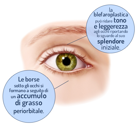 Le borse sotto gli occhi si formano a seguito di un accumulo di grasso periorbitale. Questo accumulo si forma quanto il setto orbitale ha un cedimento a causa sia della sua struttura poco elastica sia di una quantità di grasso eccessiva. Questo fenomeno può essere conseguenza dell'invecchiamento cutaneo, di danni traumatici o di una predisposizione costituzionale. La blefaroplastica può essere risolutiva di questo problema, che non trova altro rimedio se non un intervento chirurgico.